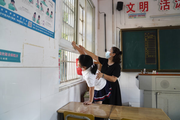 刘莺打开窗户,提前半小时给教室通风。这时,已经有孩子到了。