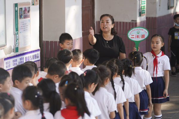 下午5时40分,二年级学生开始错峰放学。刘莺带着孩子们排好队,有序离开校园。