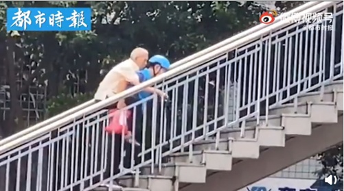 4、外卖小哥送餐途中背老人过天桥 近日,重庆有网友拍到一外卖小哥停下送餐脚步,背起行动不便的老人过天桥。视频中,外卖小哥一步步走得很艰难,但是也特别坚定。网友纷纷为小哥点赞并表示:如果你点的外卖迟到了,请不要责怪他们,因为他有可能正在帮助别人。(@都市时报)