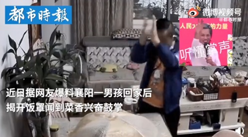 3、男孩揭开饭罩瞬间兴奋鼓掌 7日,湖北襄阳,一名男孩放学回家后,看到上中班的妈妈为他准备的饭菜,禁不住凑上去闻闻,结果兴奋得独自鼓起掌来。监控记录下这有趣的一幕,有网友表示:孩子高兴的不能自已,一看就是干饭人!(@都市时报)