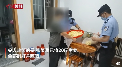 2、男子偷20斤生姜被抓获时已刮好晒好 7日,安徽省铜陵市义安区居民张某下班途中见一沿街商铺门边有不少生姜,心生歹意将20斤生姜偷走。义安分局五松派出所民警接店主报警后,迅速将张某抓获。令人啼笑的是,张某早已将20斤生姜全部刮好并晾晒。(@中新视频)