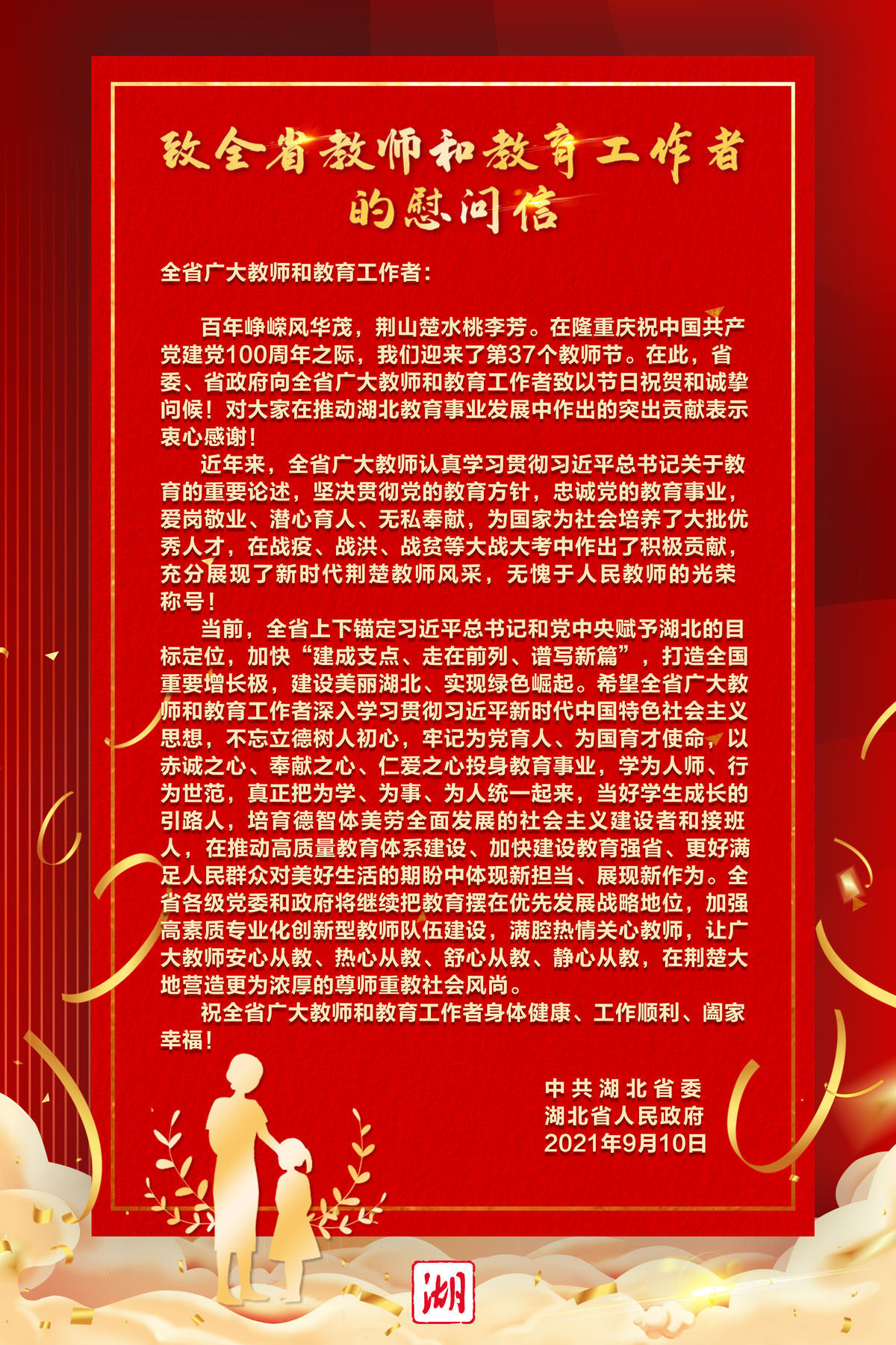 在隆重庆祝中国共产党建党100周年之际,我们迎来了第37个教师节。湖北省委、省政府向全省广大教师和教育工作者发出慰问信,致以节日祝贺和诚挚问候。慰问信全文如下: