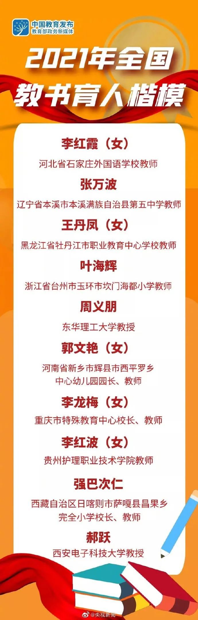 2021年全国教书育人楷模名单公布,