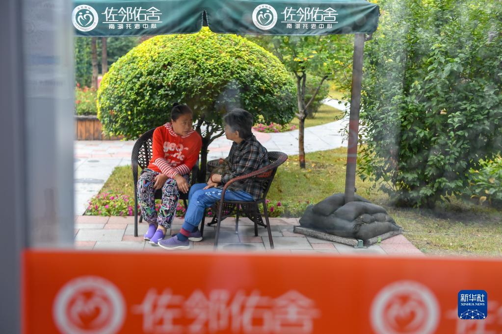 9月7日,在长春市“佐邻佑舍”南湖托老中心,老人在户外聊天。