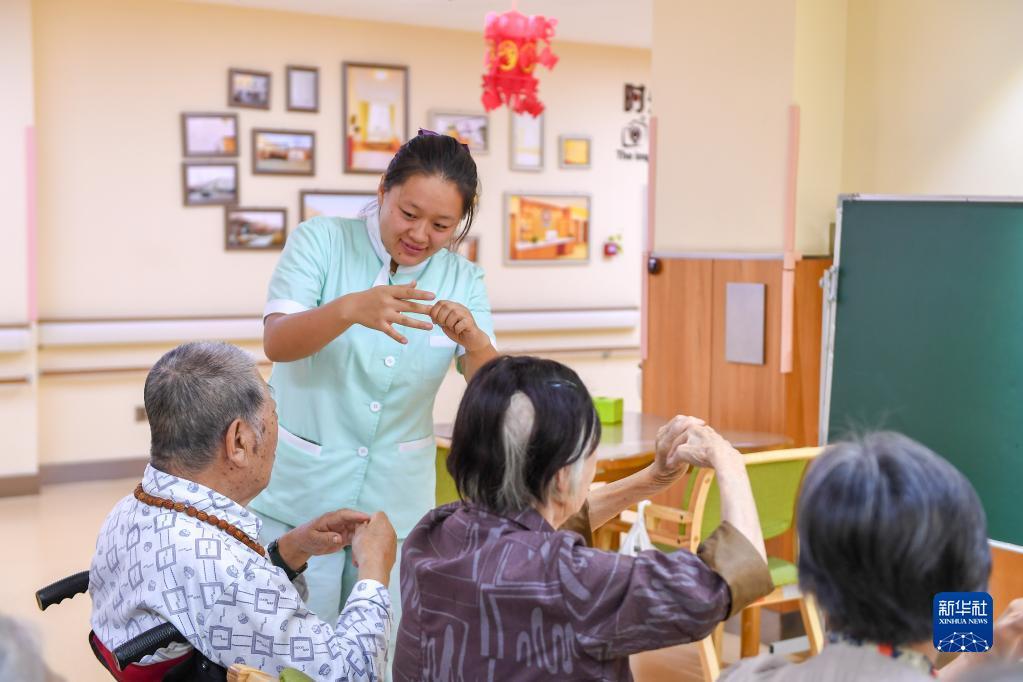 9月7日,在长春市“佐邻佑舍”南湖托老中心,护工带领老人做手指操。