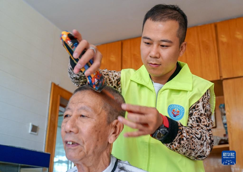 9月10日,在长春市东风社区,社工为老人提供上门理发服务。