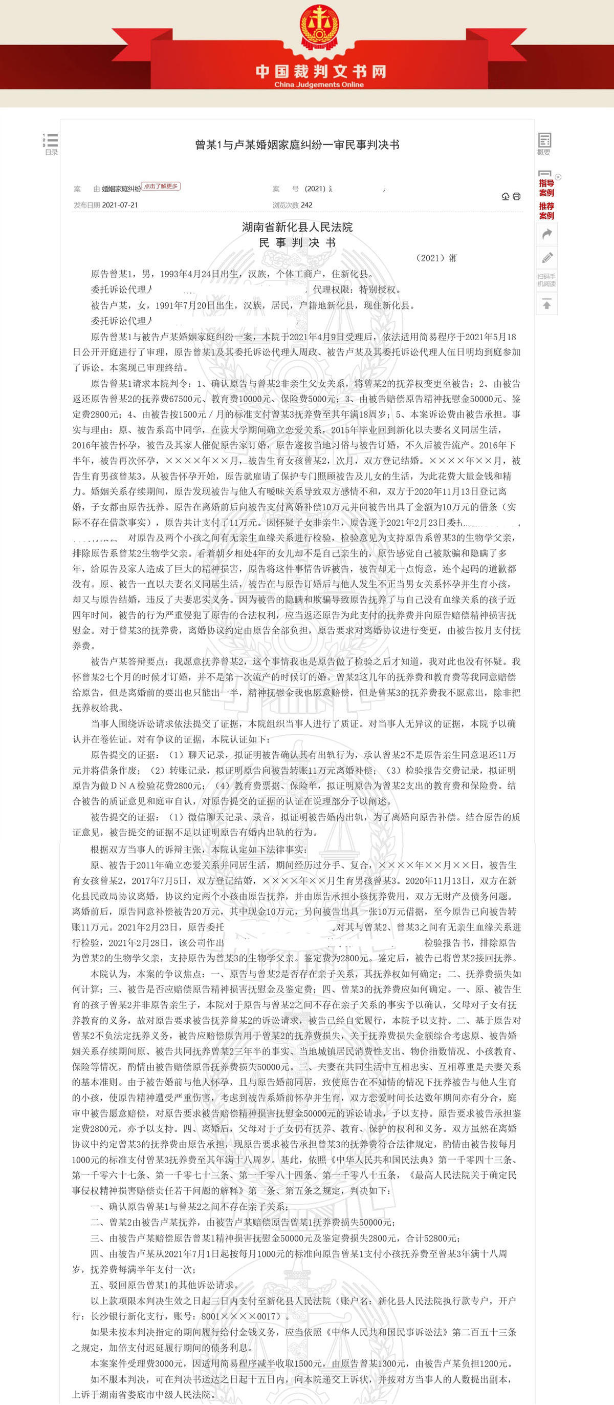 最终,新化县人民法院判决,由女方抚养4岁的女儿,并赔偿曾某抚养费5万元及精神损害抚慰金5万元,并赔偿亲子鉴定费2800元,共计10.28万元。至于两人共同生育的小儿子,女方还应当支付抚养费直至孩子成年,抚养费为每月1000元。