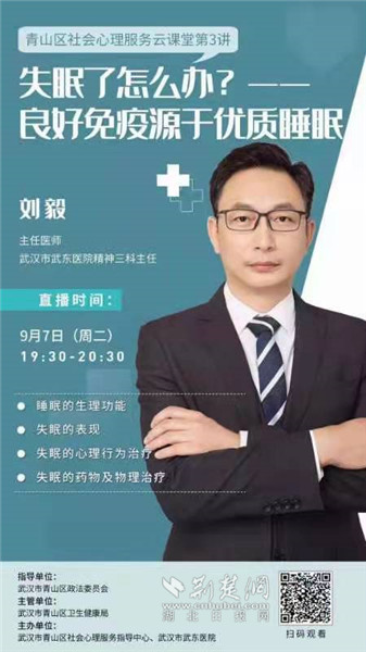 荆楚网(湖北日报网)讯(记者李燕 通讯员陈红源、孙琳)为加快实施健康中国战略,促进公民身心健康,9月7日19:30,青山区社会心理服务项目第三场心理健康讲座准时开播,讲座采用云课堂的方式进行,武汉市武东医院精神三科主任刘毅以《失眠了,怎么办?良好免疫源于优质睡眠》为题向广大市民授课。