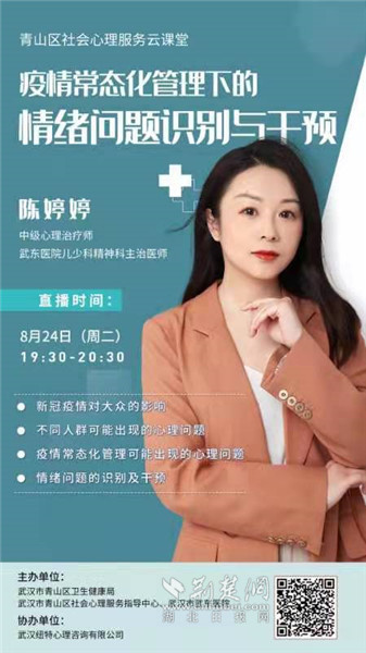 社会心理服务云课堂心理健康系列讲座由青山区委政法委和区卫生健康委统一部署,武东医院邀请心理精神专家、心理咨询师在小鹅通平台开设讲座通道,课程涵盖疫情防控期间的情绪、抑郁症以及失眠等问题,为青山区市民普及心理健康知识,提高民众心理素质。