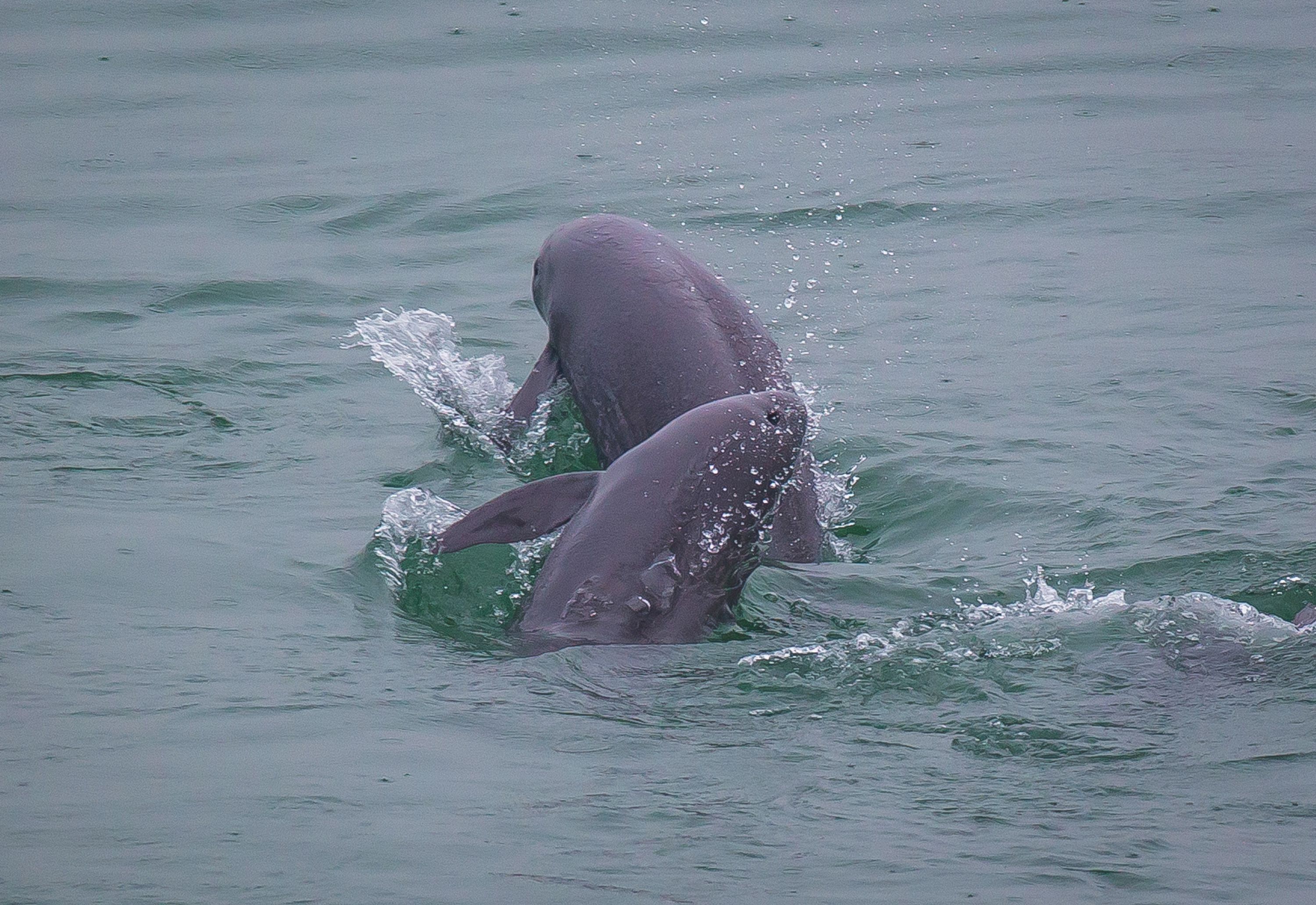 5月10日,在湖北省宜昌市江边,长江江豚在水中嬉戏。新华社记者肖艺九 摄