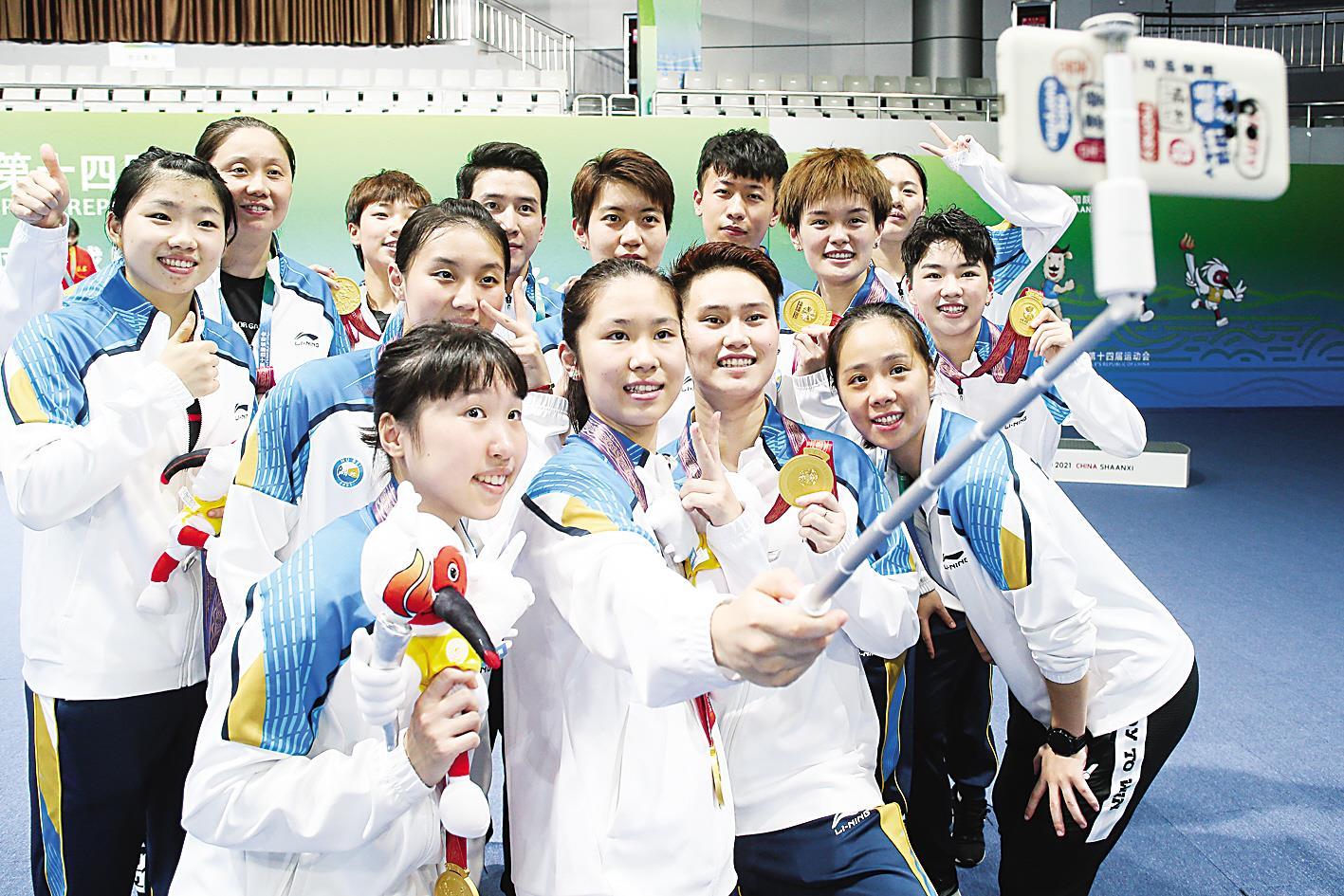 夺冠后的湖北女羽开心合影。(湖北日报全媒记者 时龚 摄)