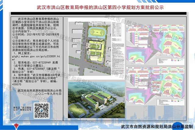 湖北日报讯(记者祝华)近日,武汉市自然资源和规划局发布公示,洪山区将新建第四小学。该小学位于洪山区洪山街南湖村,学校拟建36班,学生人数1620人,总建筑面积26238.94平方米。
