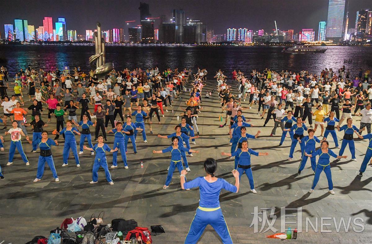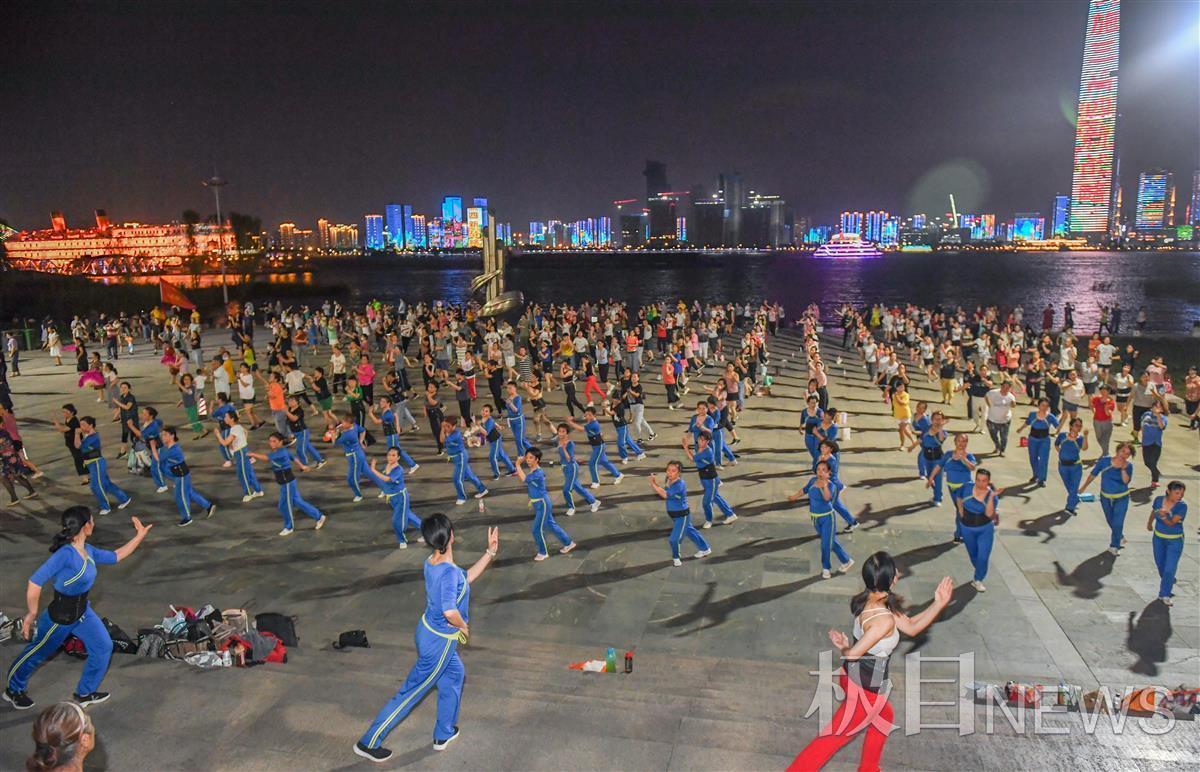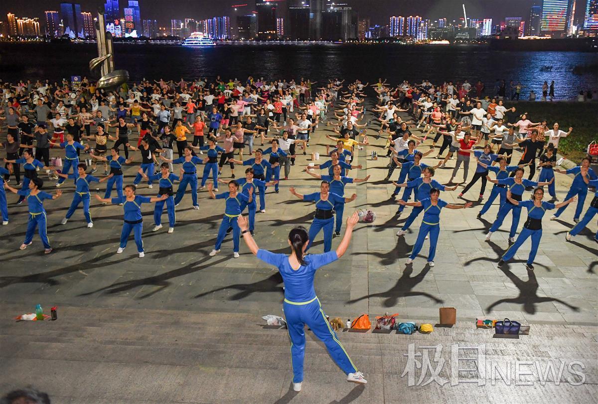 9月13日晚,汉口江滩三阳广场,凉风习习。在台上三名领舞者的带领下,400余名市民唱着欢快的音乐,愉悦地做着有氧运动。