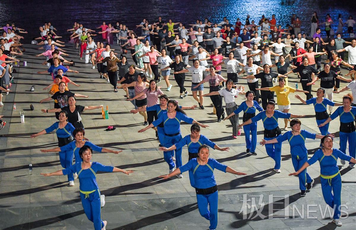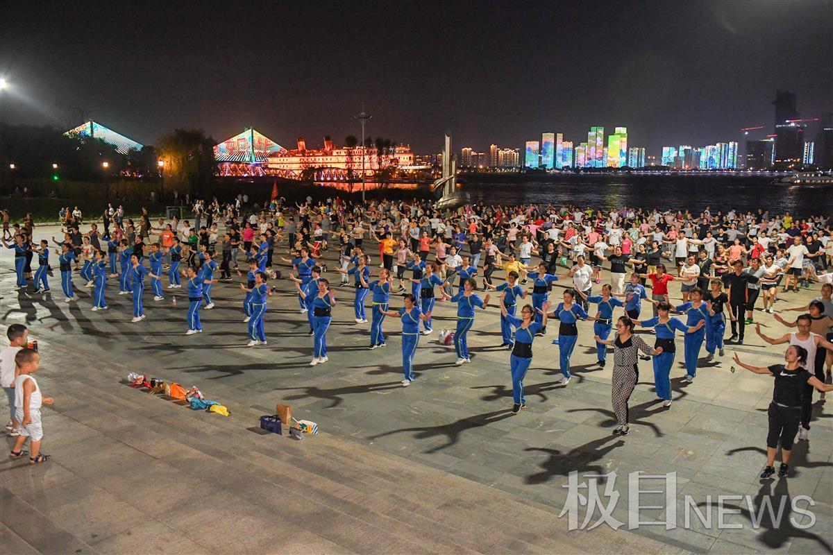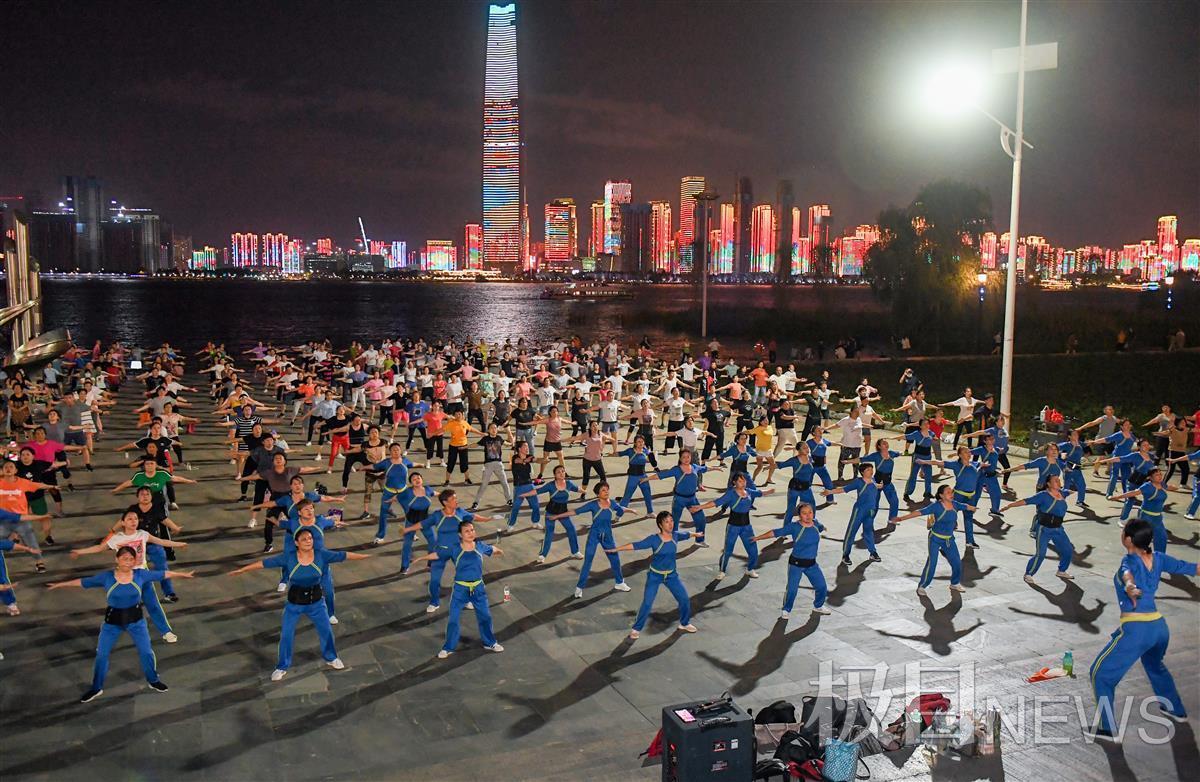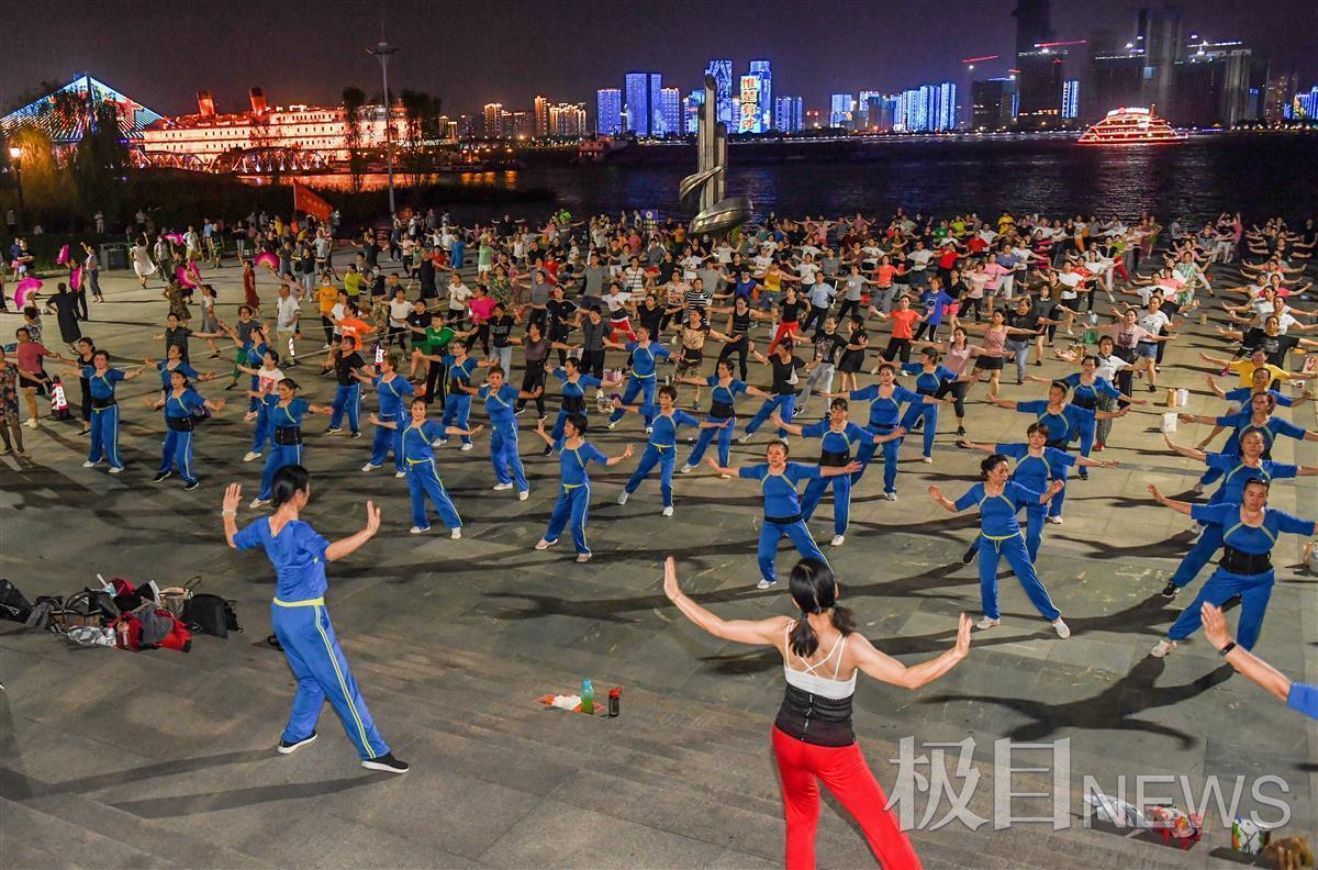 9月13日晚,汉口江滩三阳广场,凉风习习。在台上三名领舞者的带领下,400余名市民唱着欢快的音乐,愉悦地做着有氧运动。