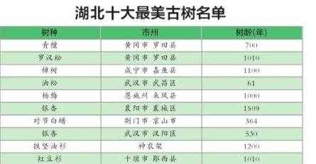 昨日,湖北省林业局正式对外发布首次评选的“湖北五大树王”和“十大最美古树”名单,意在加大重视爱树护树,展现古树风采,传承历史文化。