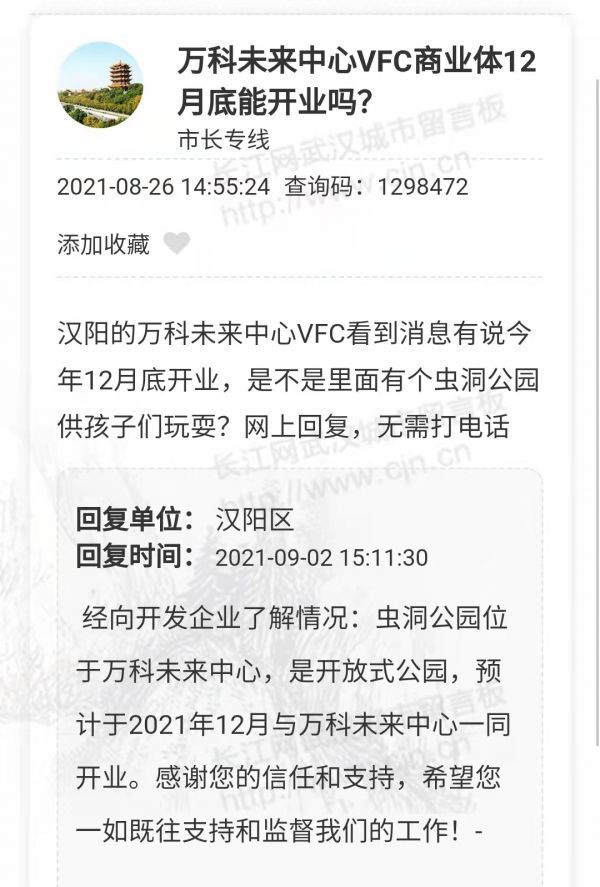 网友:汉阳的万科未来中心年内能否开业,里面是不是有个虫洞公园?