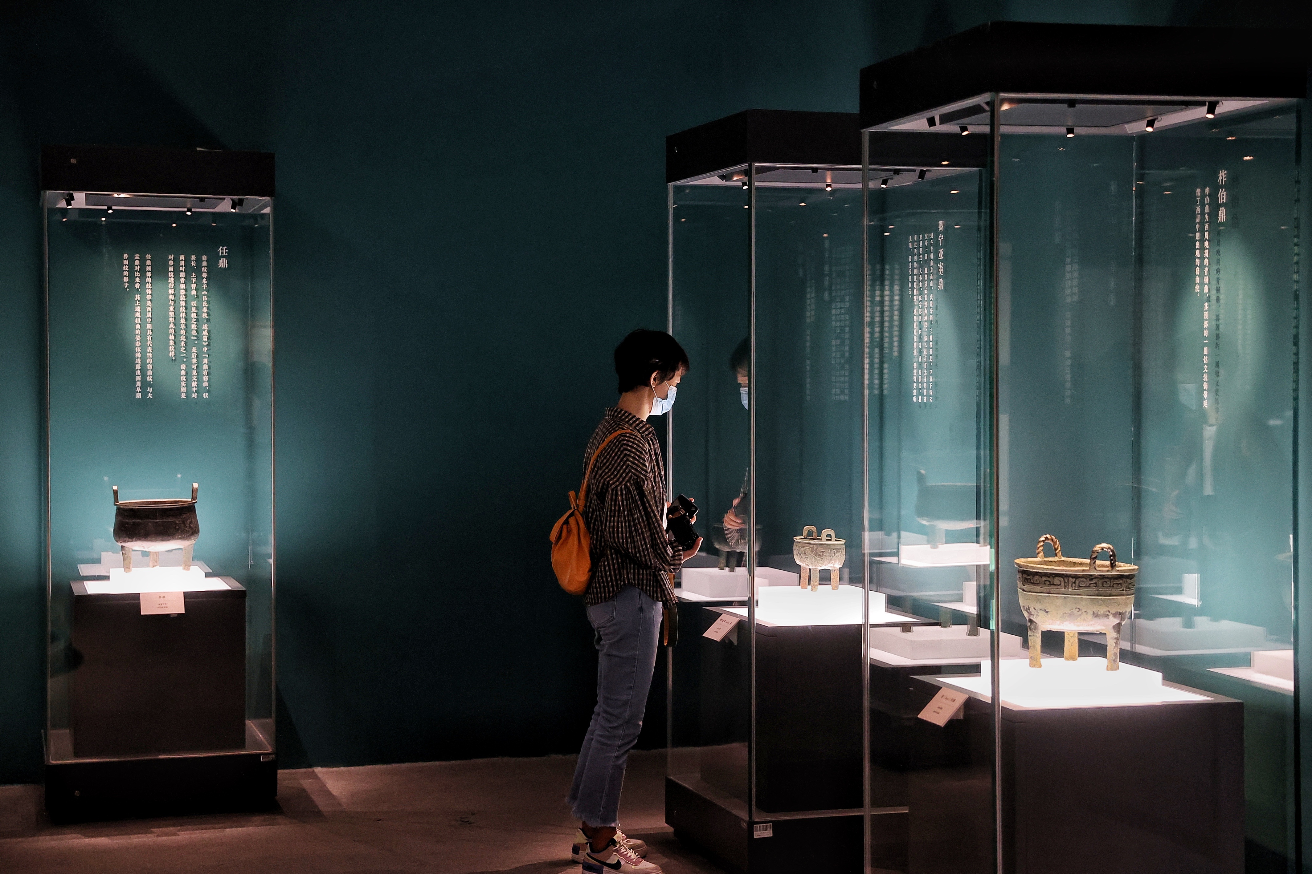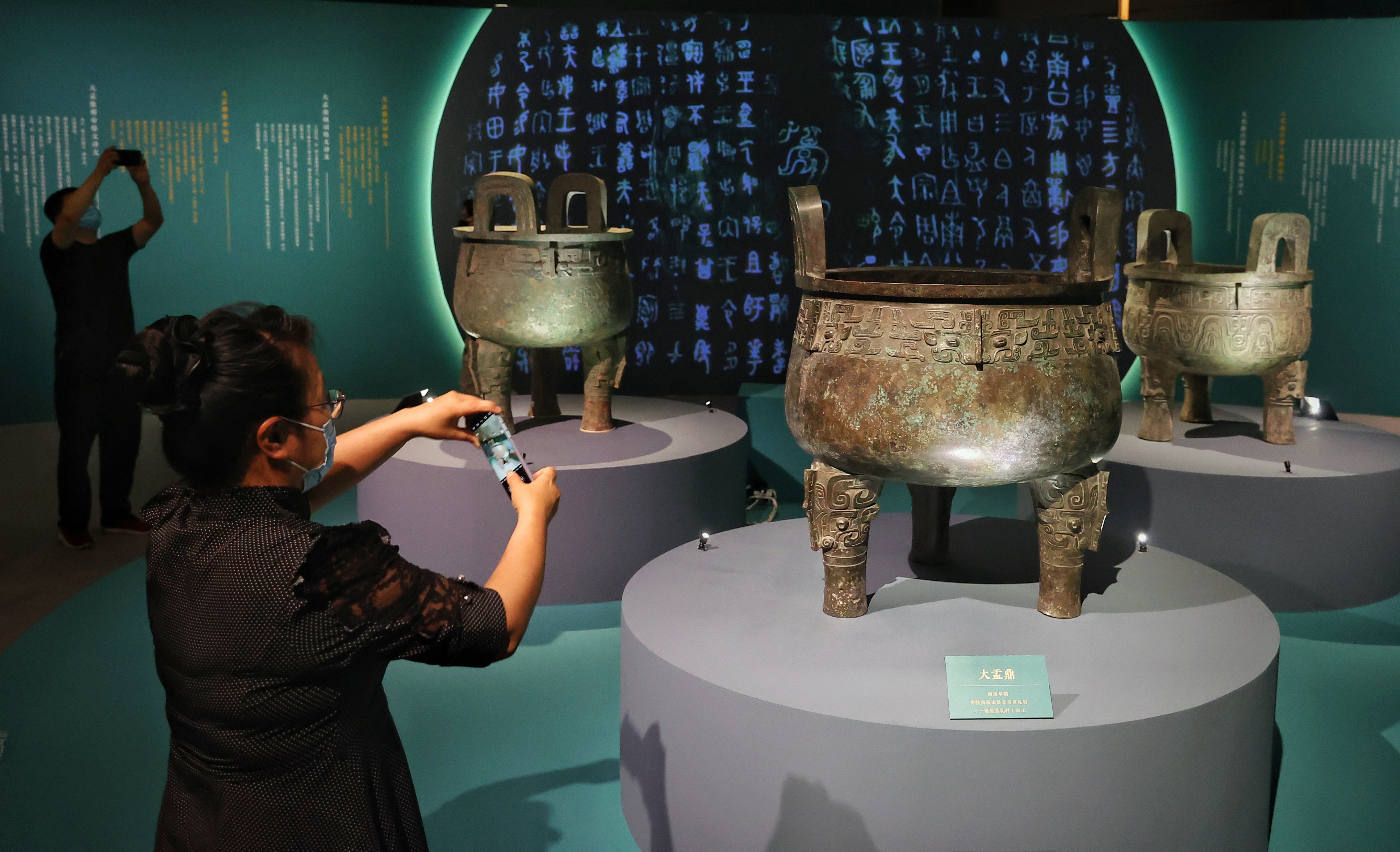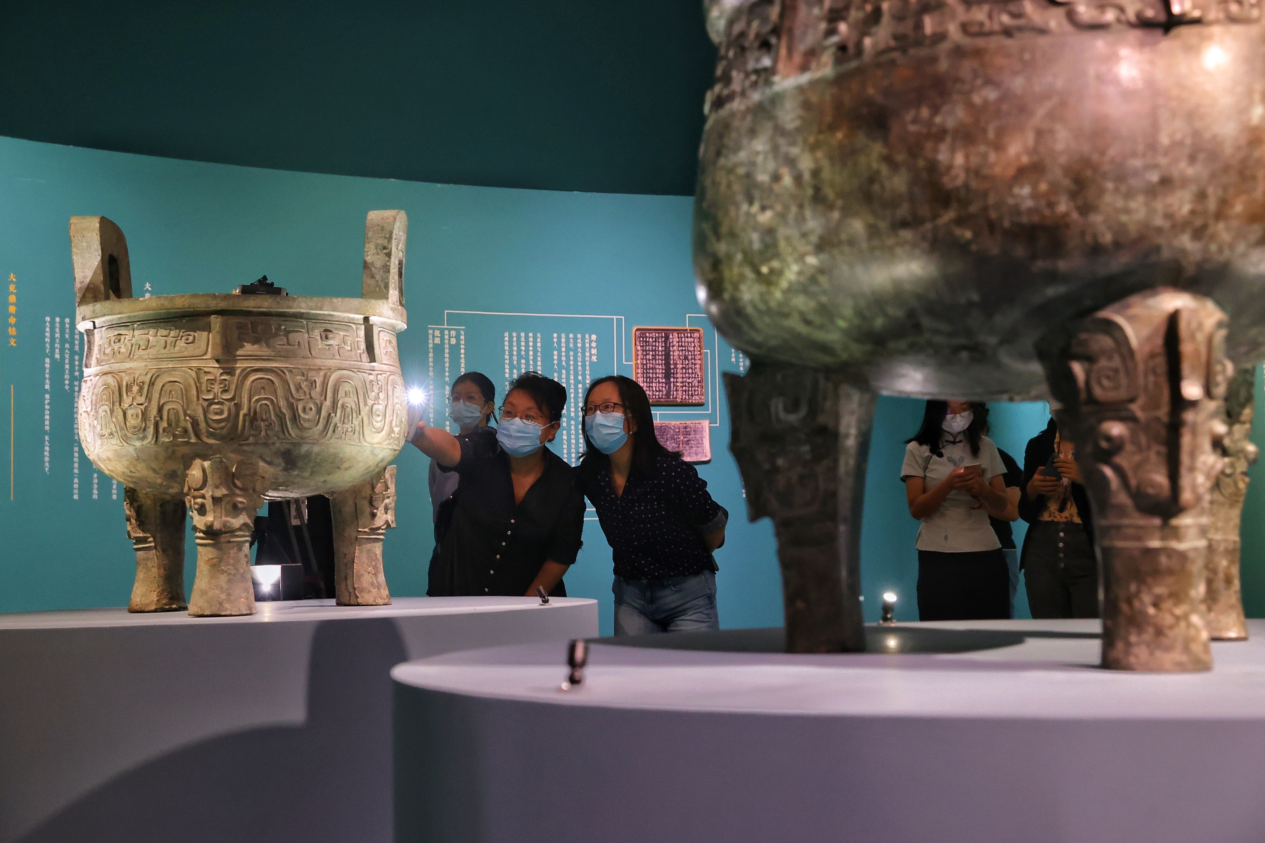观众在观赏拍摄商周时期最具代表性的三件青铜大圆鼎:子龙鼎、大盂鼎、大克鼎(从左至右)。(中国日报记者 姜东 摄)