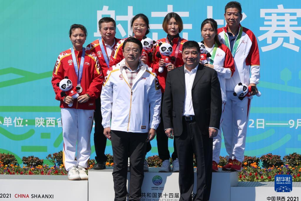 9月14日,上海队选手姜冉馨(上排左一)、上海队选手沈奕瑶(上排左三)、浙江队选手卢恺曼(右二)和教练员、颁奖嘉宾在颁奖典礼合影。