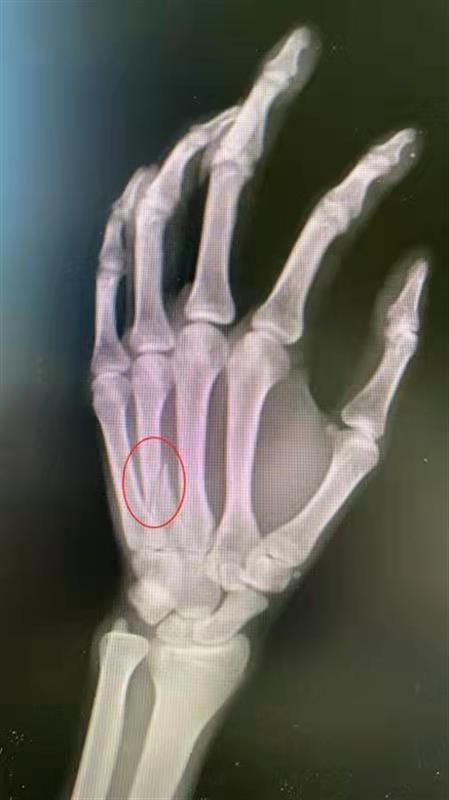 “右手第四掌骨,有明显的骨折,因为骨部位有旋转移位,需要手术固定。” 接诊的武汉市第四医院手外一科医生陈焱介绍, 像这种握拳后撞击硬物而导致骨折的,在医学上通常称为“拳击手骨折”,拳击手骨折是一种发生于掌骨的骨折。这种骨折很少发生在有拳套保护的职业拳击手身上,更多见于街头打斗中用“裸拳”打斗的人群。