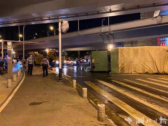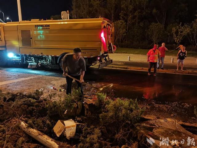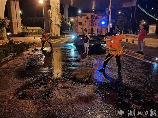 湖北日报讯 (记者张倩倩、通讯员肖赟、代娜)9月13日晚9时,武汉市汉阳区江城大道与墨水湖北路交界安全岛处,一辆渣土车因转弯车速过快导致侧翻且油箱破裂,大量柴油泄漏污染路面。为及时消除安全隐患,汉阳区城管执法局环卫集团三公司组织突击队第一时间赶赴现场,连夜清理路面油污,保障过往车辆和行人通行安全。