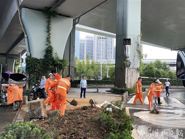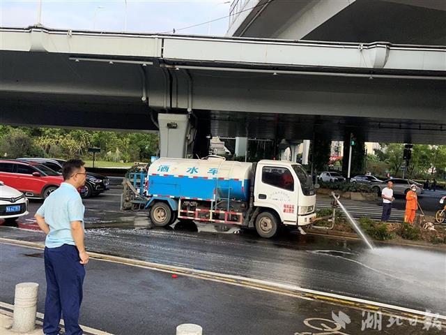 汉阳区城管执法局环卫集团三公司负责人表示,“得知这一紧急情况后,我们立即出动20余名人员、7台水车赶往事故现场进行处理。”在事故现场,环卫工人将锥筒摆放在油污污染的道路以外进行安全布控,引导过往车道安全通行。同时,用铁锹、扫把清理道路上散落的石块、泥土和受损的树木。针对路面上泄漏的油污,则喷洒大量强力除油剂稀释,随后使用吸污车和水车反复对路面进行吸污、排扫和冲洗,防止路面打滑,造成二次交通事故。