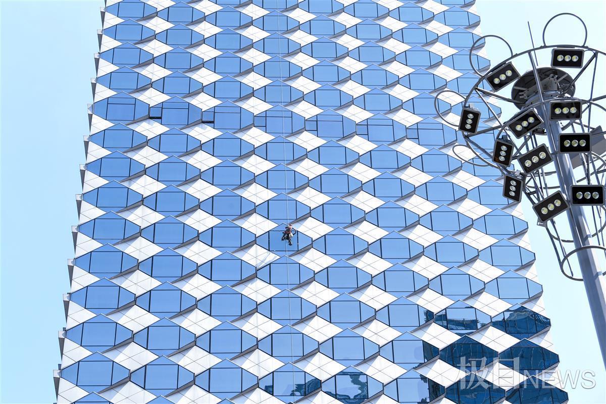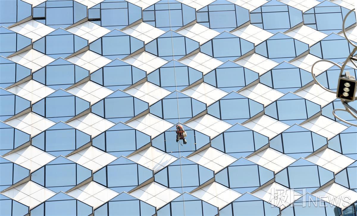 他工作区位于高楼的中部,地方距离地面超过300米,但他高空作业如履平地,娴熟地加固一块玻璃幕墙,克服着危险和辛苦,守护着这块高楼玻璃幕墙下的平安。