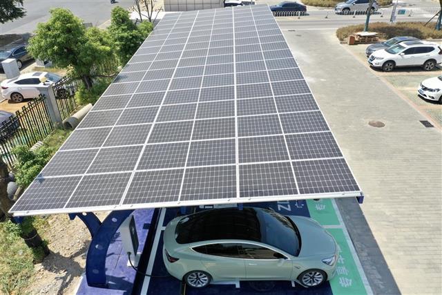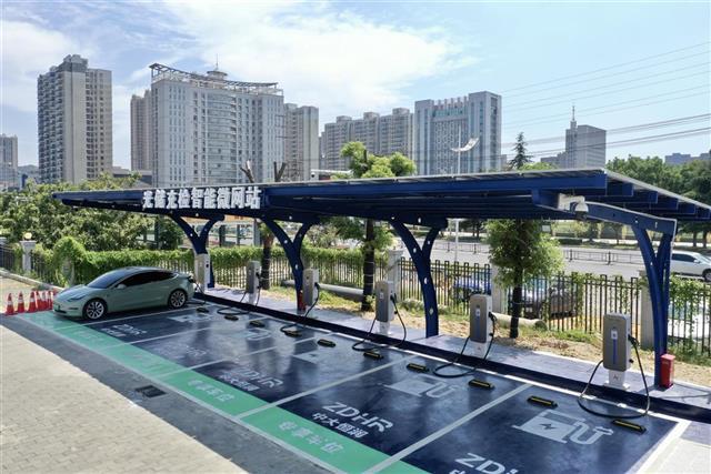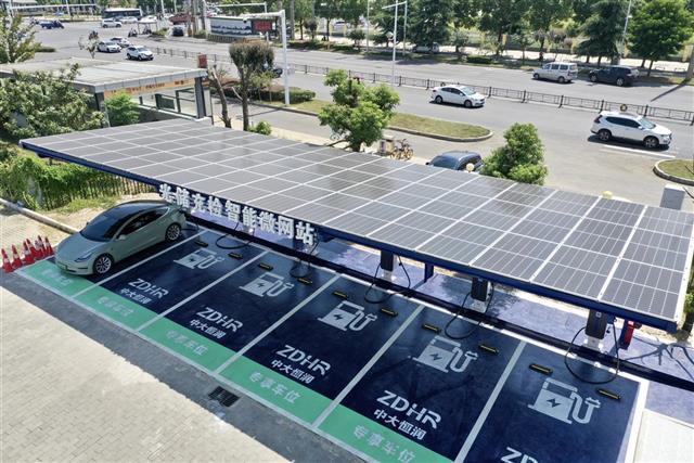 9月15日,武汉市江夏区第一人民医院停车场内,一座新建的新能源汽车充电站正在为新能源汽车充电。与普通新能源汽车充电站不同的是,这座充电站的顶部安装了近120平方米的太阳能光伏面板,旁边还设有一个专用储能柜,为充电桩源源不断供电。据了解,这是全省新建的首座光储充检智能微网充电站,是武汉市新能源充电站首次引入A级光伏板、磷酸铁锂电池储能装置、120kW V2G直流快速充电桩、深度融合AI算法的电池检测柜设备,不仅可以实现快充、储能,还可以对车辆电池进行健康检测。(湖北日报全媒记者 李溪 摄)