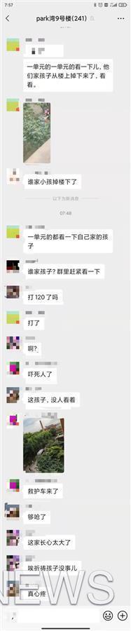 一张帕克湾小区9号楼群聊截图显示,早上7时许,有居民将一孩子仰卧在楼底的照片发至群里,并问“是谁的孩子掉楼下了”。随后,就有居民看到120救护车来到现场。