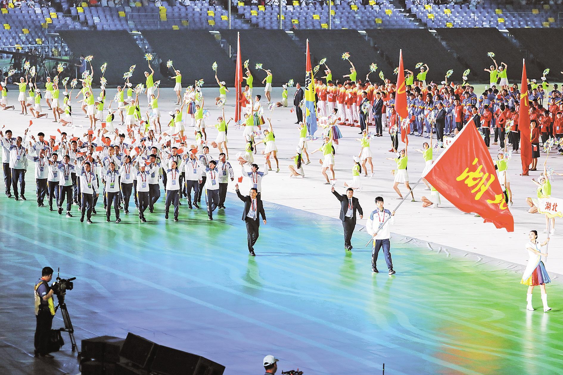 旗手张子扬引领湖北体育代表团方阵入场。(视界网 胡迪凯 摄)