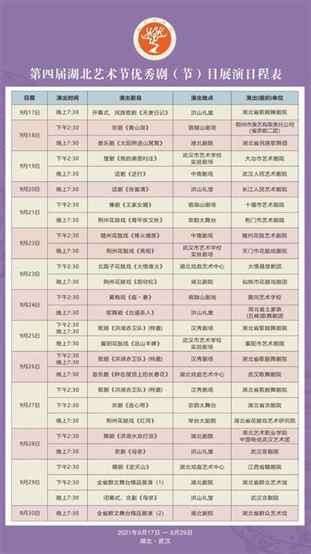 湖北日报讯(记者王理略、通讯员鄂文旅)9月17日晚,第四届湖北艺术节将在武汉洪山礼堂拉开帷幕。湖北艺术节是我省水平最高、规格最高、规模最大的综合性艺术活动,本届艺术节恰逢建党100周年、“十四五”开局之年,正处在湖北加快疫后重振、奋力浴火重生的关键时期,具有特别意义。