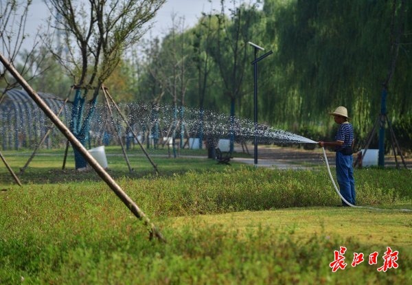9月16日早晨,连续多日的晴热天气使得植物也缺水“喊渴”。东西湖白马泾公园里,几位工作人员正忙着采取不同措施为花草树木浇水。长江日报 记者李永刚 摄