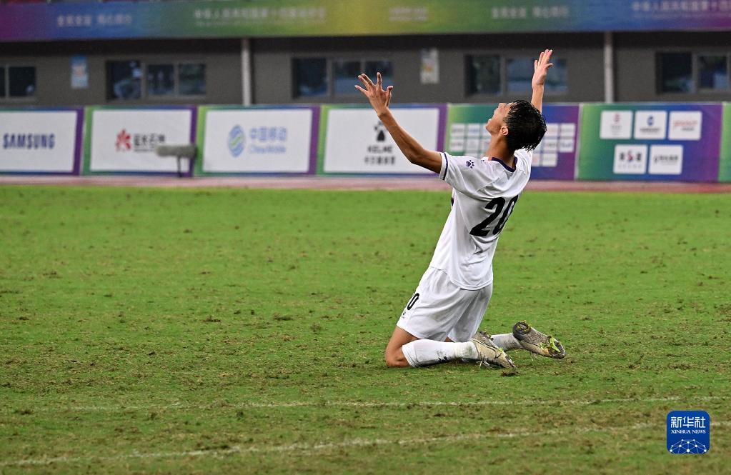 9月16日,新疆队球员于子然踢进最后一个点球后欢呼庆祝。