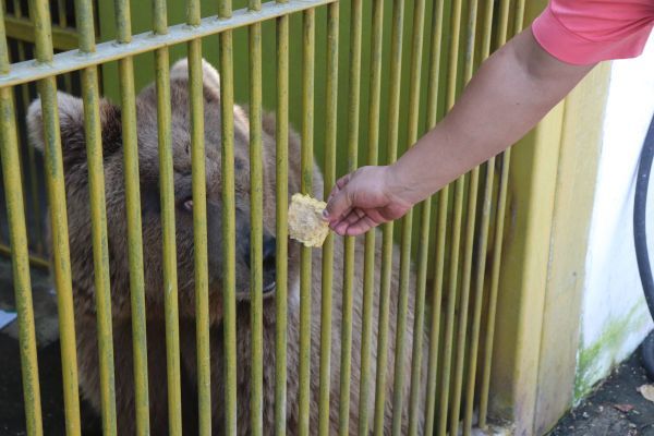 “我们熊宝宝平常吃肉沫配窝头,肯定爱吃这个月饼。”饲养员刘应龙是2头棕熊和1头黑熊的奶爸,他从营养师手里接过3个肉馅和蛋黄的月饼,依次丢进黑熊和棕熊的笼舍内。只见,黑熊三口吃完一个蛋黄月饼、而2只棕熊都是细嚼慢咽地吃肉馅月饼。“别看棕熊个头大,吃饭还是很斯文的。”