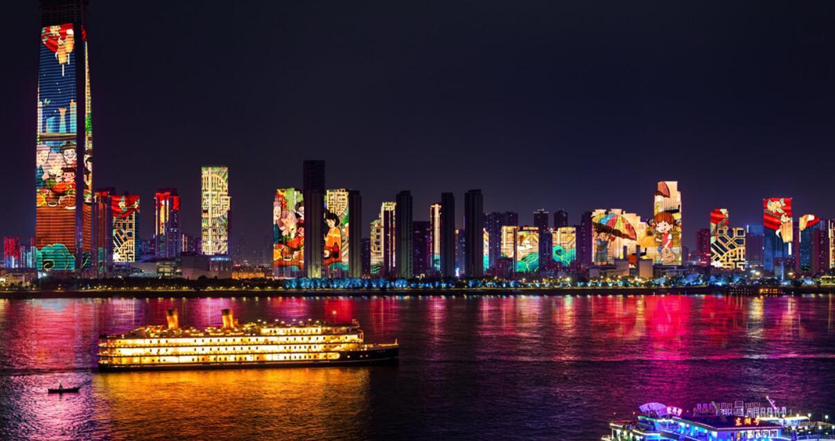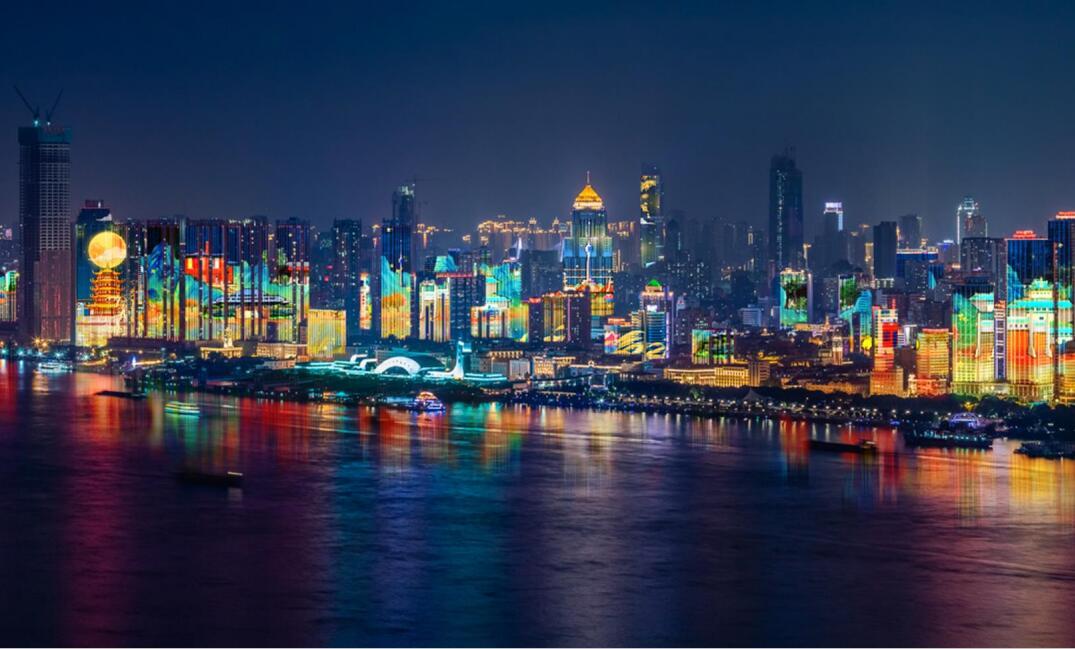 此外,灯光秀展播期间,市民游客还可在欣赏到“明月寄相思,家国总关情”“月满中秋,乐享江城”“但愿人长久,千里共婵娟”等标语跃上长江二桥和两岸楼宇。