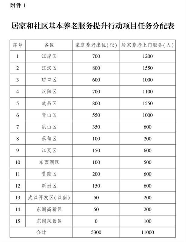 湖北日报讯(记者严运涛)武汉市政府官网9月18日发布《武汉市居家和社区基本养老服务提升行动项目实施方案》,要求到2022年2月底前,全市建成家庭养老床位不少于5300张,服务人数不少于11000人。