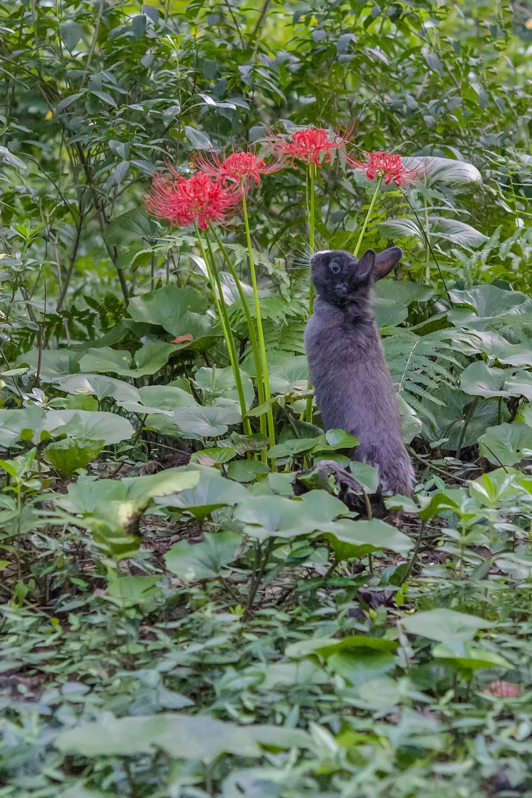 (出自明朝谢复《秋香径》 ,图为一只野兔在石蒜花下驻留,石蒜又名彼岸花、曼珠沙华,是我国南方野外常见的一种秋花植物,图片来源@视觉中国)