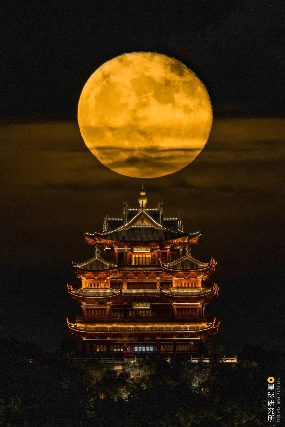 (出自唐朝李白《渡荆门送别》;下图为杭州,在西湖苏堤之上眺望城隍阁,皎洁的明月映照着高楼,摄影师@三夏)