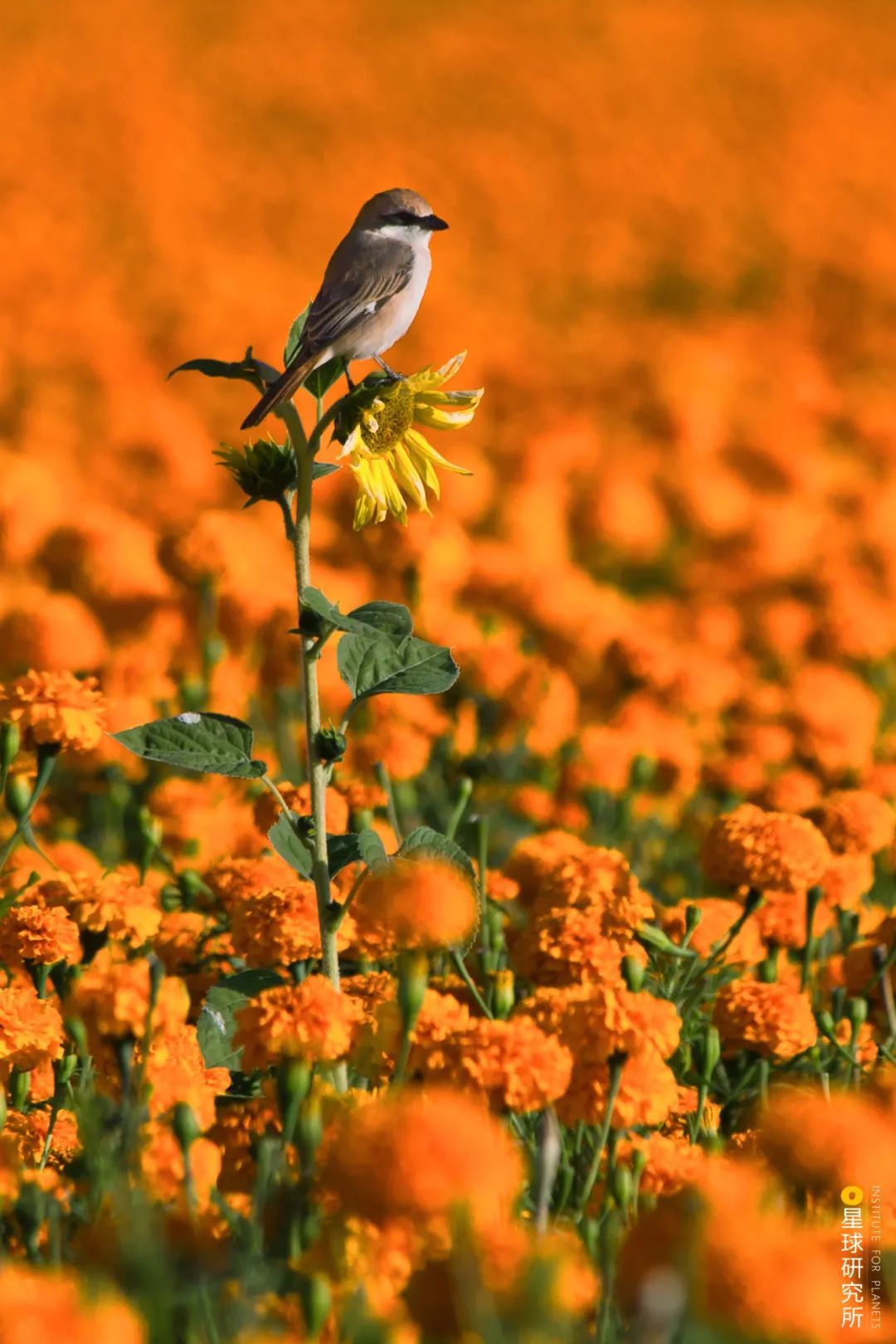 (出自宋朝钱时《立冬前一日霜对菊有感》;下图为新疆博乐菊花种植园,一只小鸟站在菊花丛中的向日葵之上,摄影师@赖宇宁)