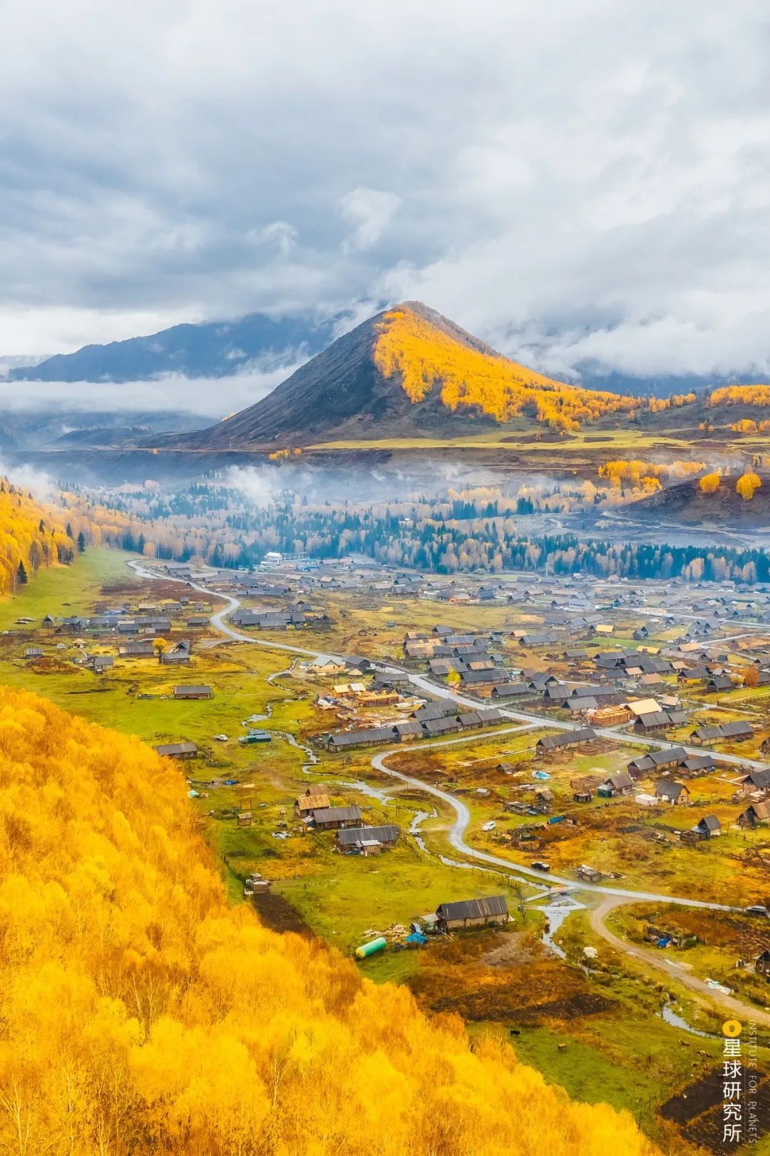(出自唐朝王勃《山中》;下图为新疆阿勒泰地区布尔津县禾木村,由于山坡坡向的不同,远处的山峰秋色各异,摄影师@焦潇翔)