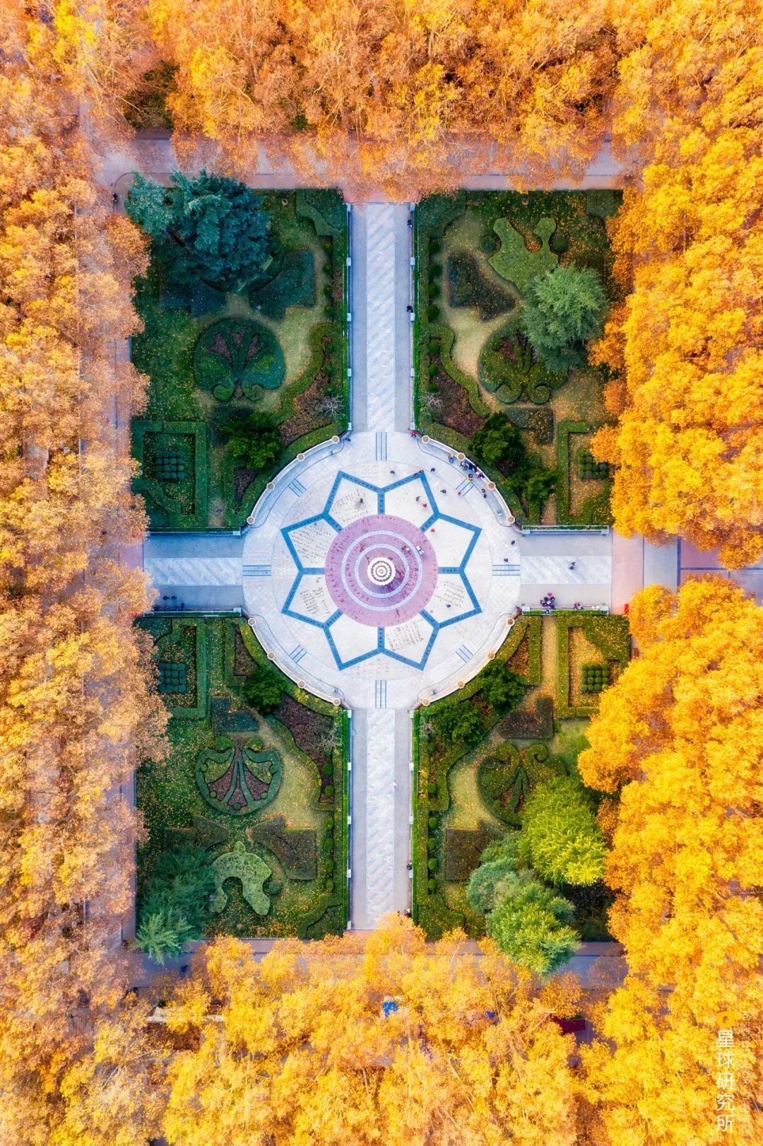 (出自清朝纳兰性德《如梦令》;下图为郑州人民公园,法桐(悬铃木)已然金黄,广场中央的树木仍显苍翠,摄影师@焦潇翔)