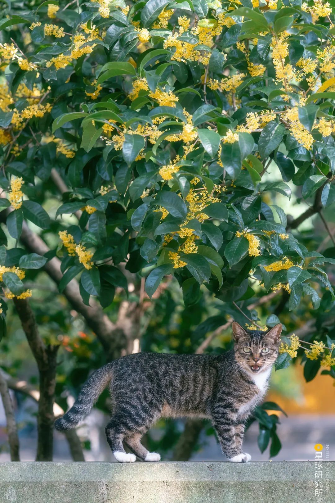 (出自宋朝黄庭坚《答许觉之惠桂花椰子茶盂二首》 ;下图中为杭州净慈寺,桂花落雨,狸猫闲逸,摄影师@喵呜不停)