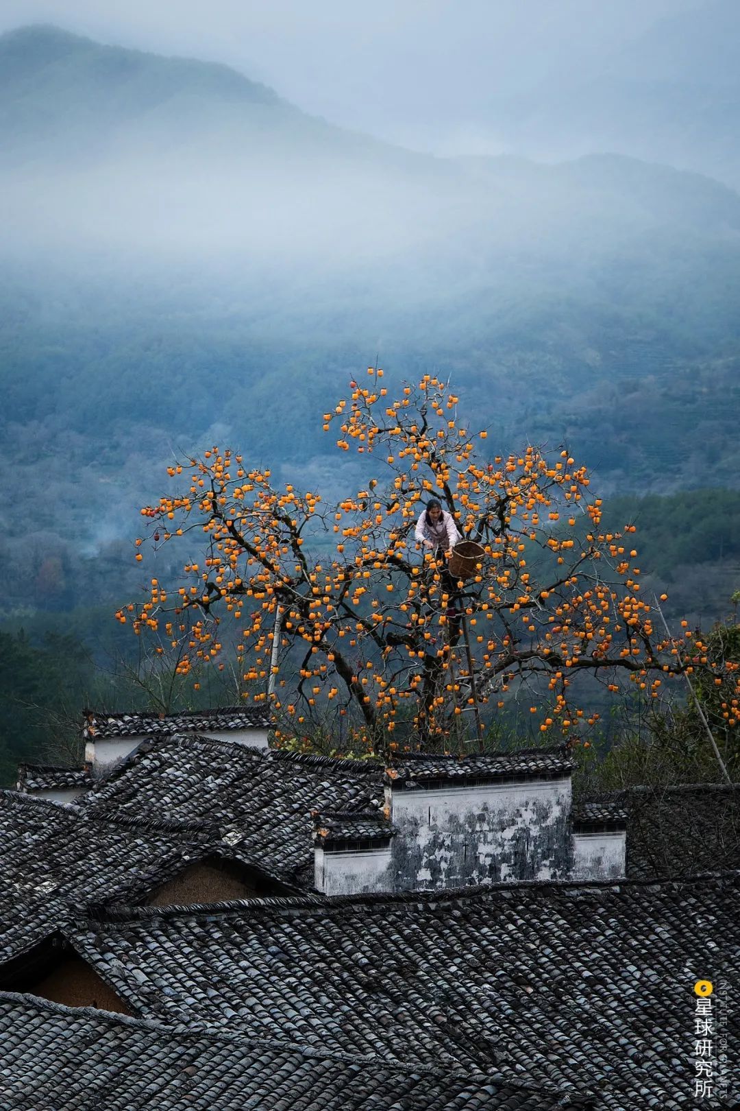 (出自宋朝范宗尹《游龙华寺二首》;下图为安徽黄山姬川村,村民在采摘成熟的柿子,摄影师@城市穿梭客)