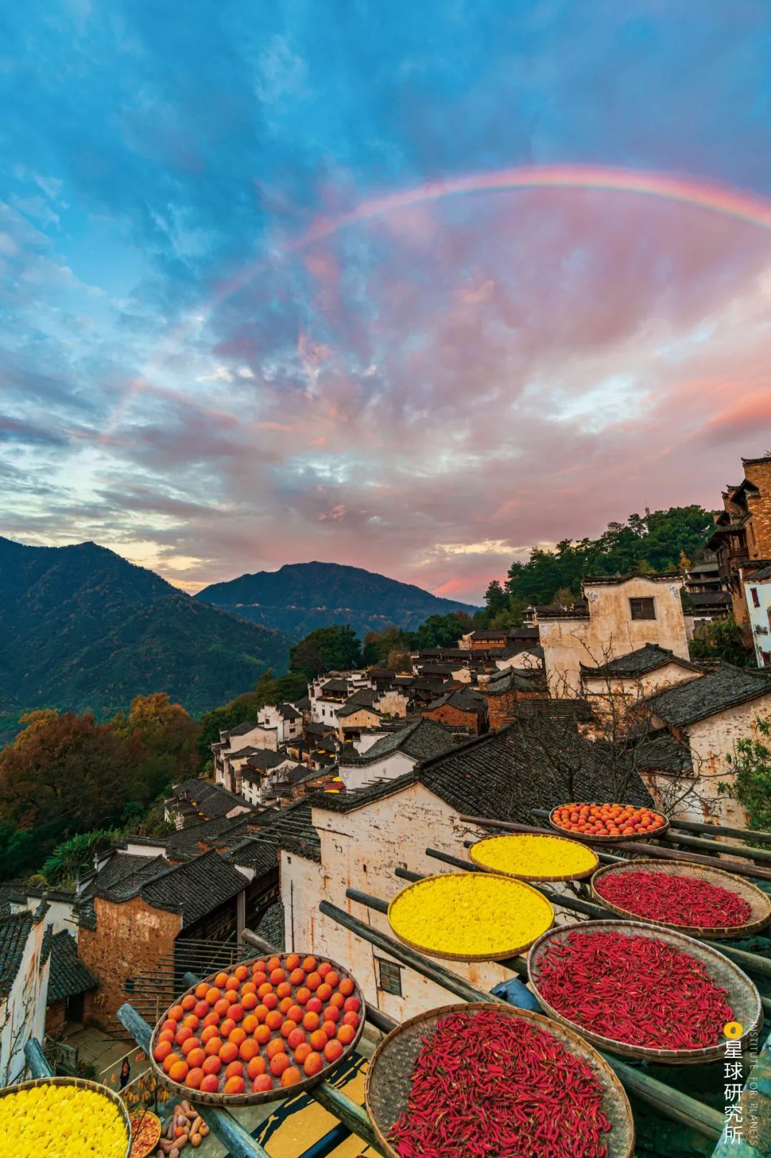 (出自清朝文昭《八月十五日田间请客》;下图为江西婺源,每到秋天家家户户都会晾晒辣椒、菊花和柿子等物产,摄影师@石耀臣)