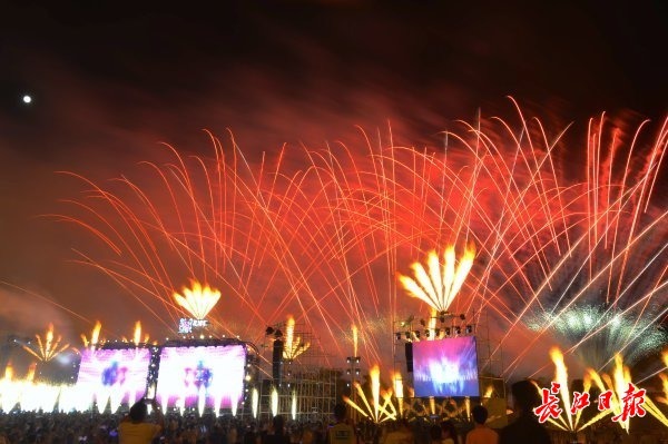 蔡甸区花博汇举行的一场盛大绚丽多彩的烟火舞台秀,大批市民前来游园,欣赏这一视听盛宴。 长江日报记者胡冬冬 摄