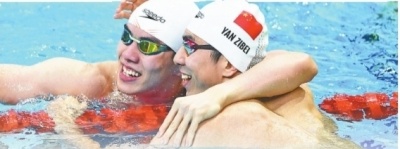 9月20日,获得冠军的湖北队选手闫子贝(右)和获得亚军的队友孙佳俊在比赛后庆祝。