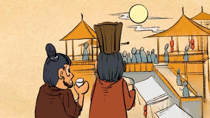 宋代文学家孟元老《东京梦华录》中记载“中秋夜,贵家结饰台榭,民间争占酒楼玩月”。中秋节,京城的所有店家、酒楼都要重新装饰门面,一些有钱人在自己的楼台亭阁摆上食品安排家宴,百姓们则登上夜市高楼,共同赏月。