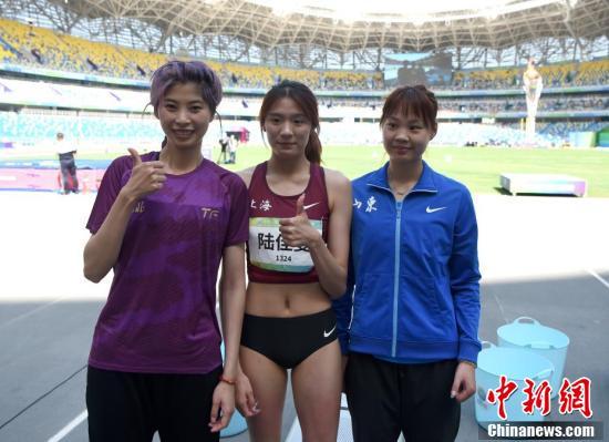 9月21日上午,第十四届全运会田径女子跳高决赛在西安举行,上海“00后”小将陆佳雯以1.92米刷新个人最好成绩的结果获得冠军。图为陆佳雯(中)与亚军刘肼毅(左)、季军张春璐在赛后合影。 中新社记者 侯宇 摄