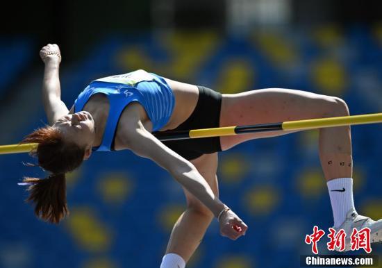 9月21日上午,第十四届全运会田径女子跳高决赛在西安举行,上海“00后”小将陆佳雯以1.92米刷新个人最好成绩的结果获得冠军。图为陆佳雯在比赛中。 中新社记者 侯宇 摄