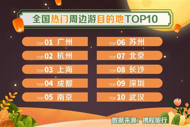 湖北日报讯(记者王理略、通讯员滕林林)9月21日,中秋假期最后一天,携程发布《2021年中秋假期旅游数据报告》,数据显示,今年中秋,最热门的周边游目的地多数集中在华东、华南地区,前十分别为:广州、杭州、上海、成都、南京、苏州、北京、长沙、深圳、武汉。