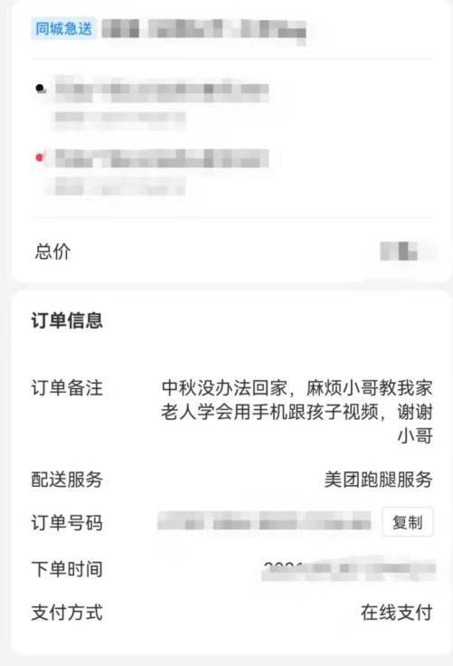 在上海工作的王女士告诉记者,就在这个小长假通过跑腿为父母点了一餐他们最爱吃的老字号中秋套餐。“公司有项目要赶进度,中秋节没办法按计划回去,所以还是想着下单跑腿,买了中秋餐给家里的老人,弥补一下遗憾。”